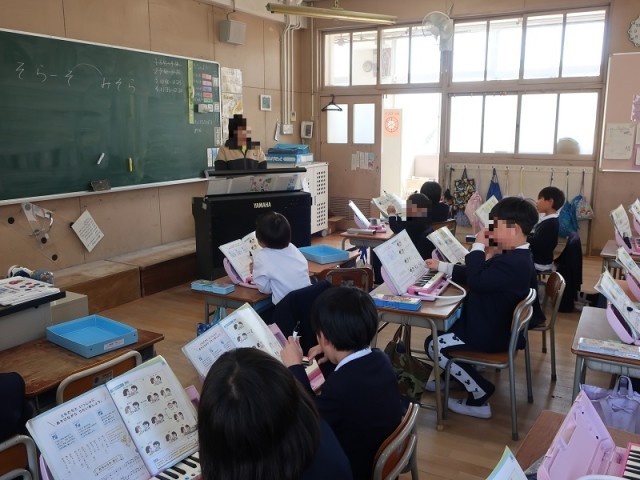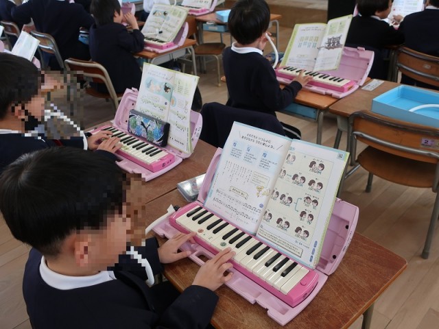 1年生の音楽の授業風景です。「おちゃらかほい」を鍵盤ハーモニカで演奏します。先生のオルガンに合わせて、みんなできれいに演奏することができました。