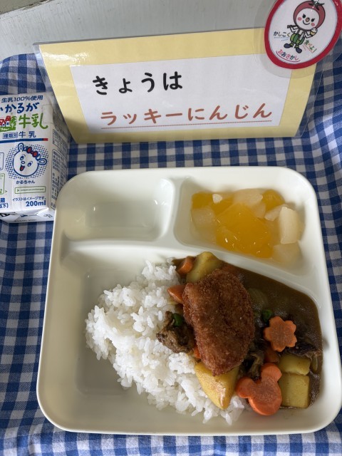児童生徒に好評な「カツカレーライス」です。小麦不使用の米粉カツを使用し、小麦アレルギーの児童生徒も食べることができます。