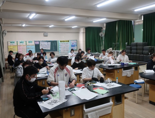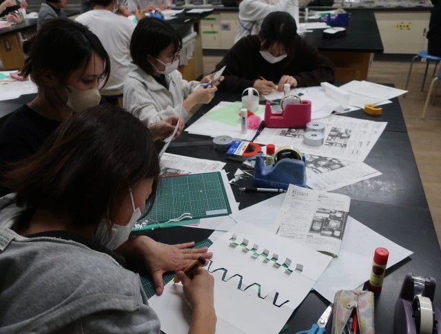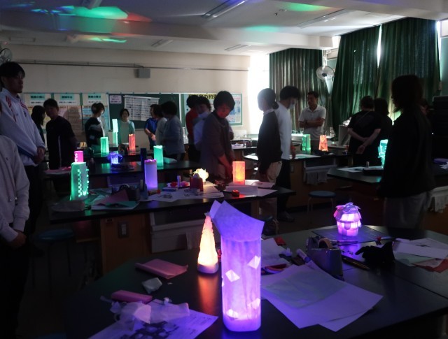 最後は、作品の相互鑑賞を行いました。教室の電気を消して鑑賞したのですが、光を通した紙の見え方が幻想的でとてもきれいでした。