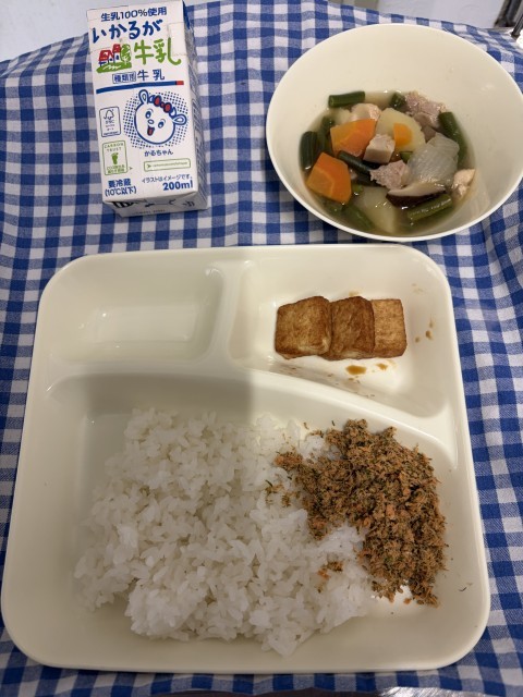 「鶏肉とじゃがいもの煮もの」は、鶏肉、じゃがいも、たまねぎ、にんじん、しいたけ、青みにさんどまめを使用した和風の煮ものです。