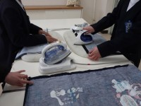 5年生の家庭科の授業風景です。エプロンづくりを行っています。ミシンの糸かけや、ア...