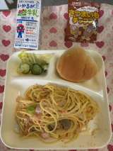 今日の献立 ・さけのクリームスパゲッティ ・キャベツときゅうりのサラダ ・おさつ...