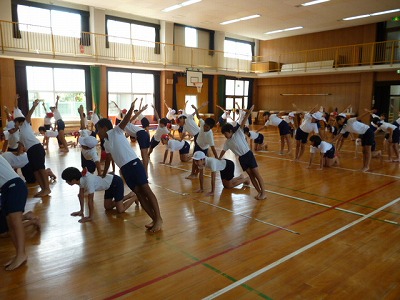 6年生が、工事着工に入る直前の講堂にて、3クラス合同で運動会で演技する「組み体操」の練習をしていました。