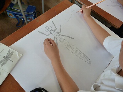 3年1組が図工の授業で。昆虫の絵を画用紙いっぱいに描いていました。