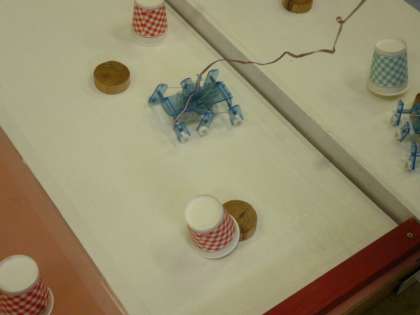 講習会では、競技大会に使用するロボットのベースを約2時間近くかけて製作し、その後、競技用のコートで試走しました。