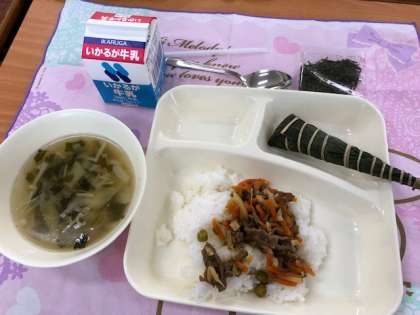 今日は、子どもの日の行事献立で、「ちまき」が出ました。