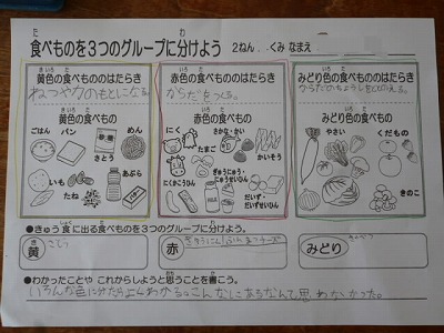 食べ物を「黄」「赤」「みどり」3つの色に分類し、それぞれのグループの食べ物の働きについて学びました。