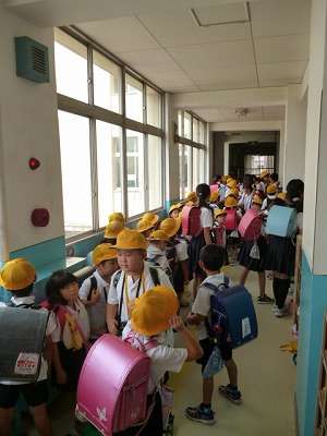 緊急放送の後、まずは6年生が自分の地区の1年生を教室まで迎えに行きました。