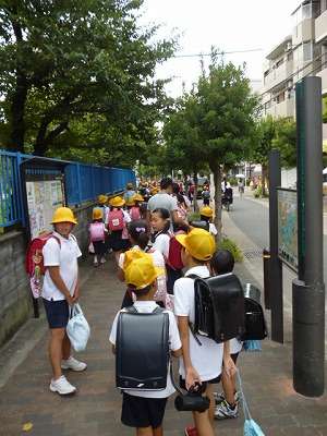 その後、2〜5年生も各地区ごとの集合場所に移動し、地区リーダーが人員の確認を行いました。