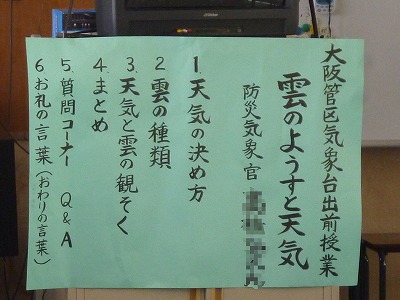 気象庁大阪管区気象台よりお二人の方を迎え、「雲のようすと天気」「天気予報ができるまで」「かみなりに気をつけよう」「台風について」の授業を受けました。