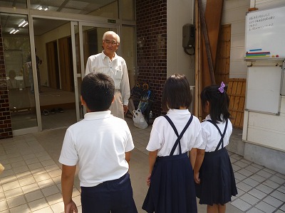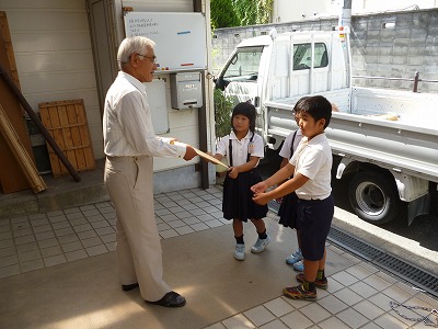 2年生の各クラスの代表児童が、昨日に書いていた「おじいちゃん・おばあちゃんへの手紙」を豊新憩いの家に持っていき、敬老会の代表の方に渡しました。