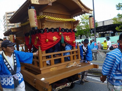 パレード会場はたくさんの人が見学していて、その中を「わっしょい、わっしょい」と大きなかけ声を出しながら、元気よく1時間半ほど2台の山車(だし)をひっぱてくれました。