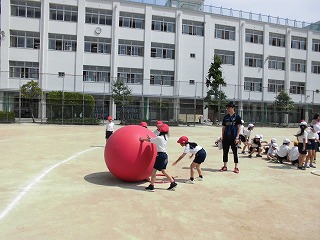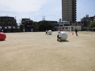 運動会に向けて、大玉転がしをしました。輪の中にきちんと入れて次の人と交代です。
