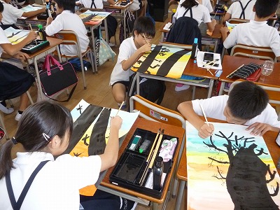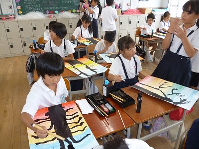 以前に画用紙に「夕日の風景」ということで、薄く色をグラデーションしながら塗っていたものを背景にして、今日は、そこに習字の墨・大筆・小筆、そして割りばしの先端をとがらせたものを使って、大木や竹、その他動物などを描き入れていました。