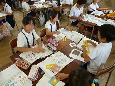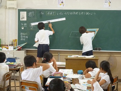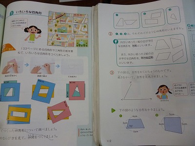平行や垂直を学んだ後に、教科書にある図形カードを2枚使って四角形を描き、その特徴(台形や平行四辺形など)を考えていく授業でした。