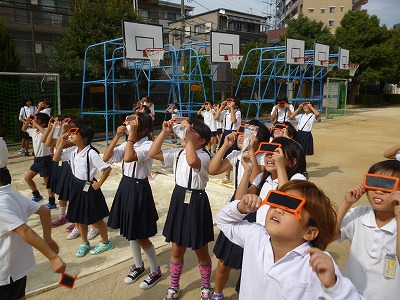 3年1組が理科の授業で、教室を飛び出し運動場で太陽の観察をしていました。