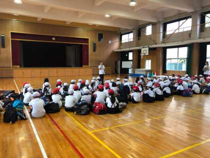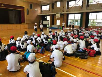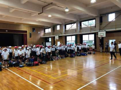 あいにくの雨ですが、5年生が林間学習に出発しました。