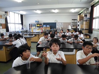 はじめに、カップを用意します。割り箸をもらい、水のり20ccを正確に、はかり混ぜていきました。