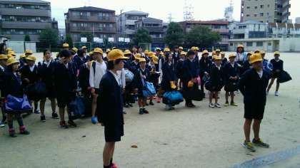 天候が心配されるのですが、何とか運動場で出発式を行い、みんな笑顔でバスに乗り込んでいました。
