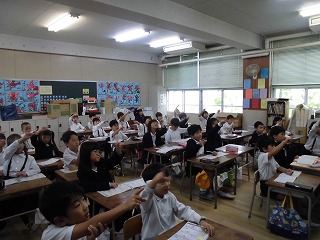 腕をしっかりあげて。まず全体で書き順の確認をしました。