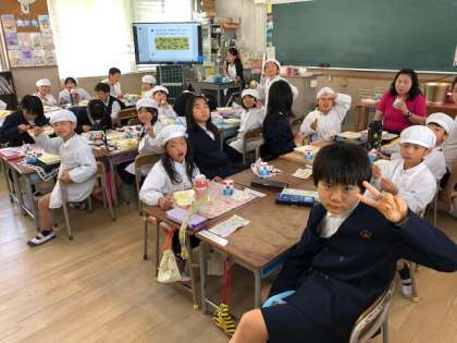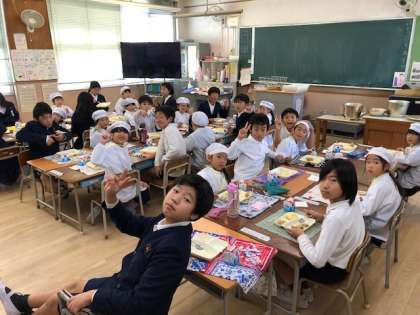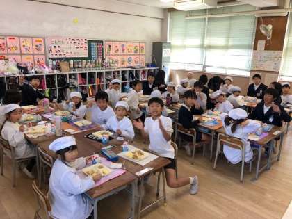1年生のみなさんは、6年生のお兄さん、お姉さんの給食を食べる量や速さに驚きながら、楽しく給食を食べることができました。
