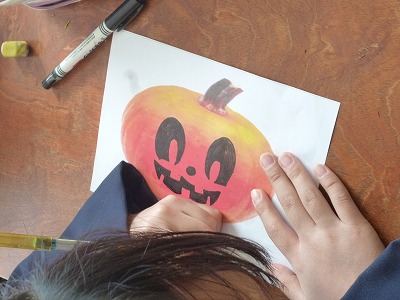 「魔女」「おばけ」「ミイラ」等の英語を教わったり、でみんなで「ジャック・オー・ランタン」のオリジナルデザインを考えたりしました。