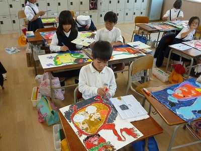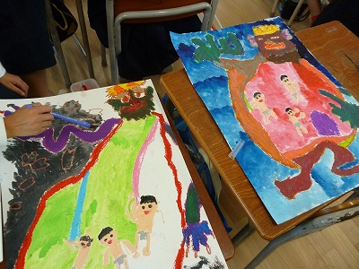 2年3組では、「じごくのそうべえ」の絵を描く題材で、絵の具の使いかた(水の量)を学んでいました。