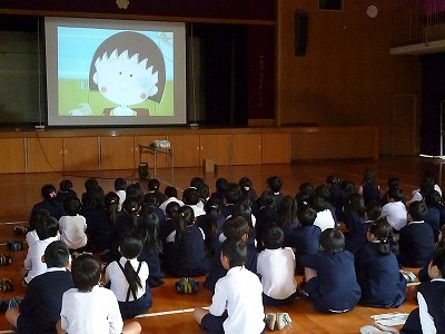 まず始めに講堂内で「ちびまる子ちゃんの火災に関する」ビデオを見ました。