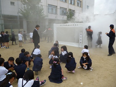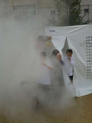 その後、運動場に出て煙体験です。