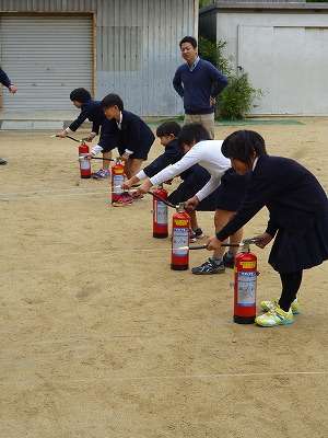 隊長さんから消火器の扱い方について説明を受け、全員が交代で体験しました。
