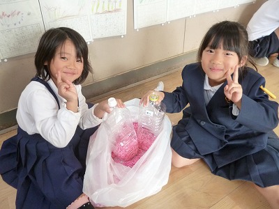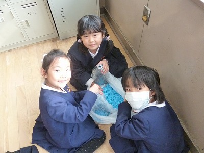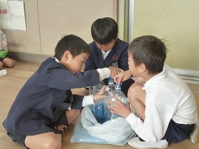 2リットルのペットボトルに、先生が画用紙をシュレッダーで細かくした紙片を、子ども達は少しずつていねいに詰め込んでいました。