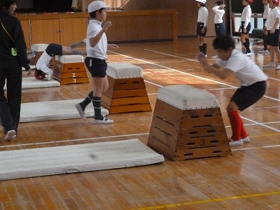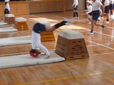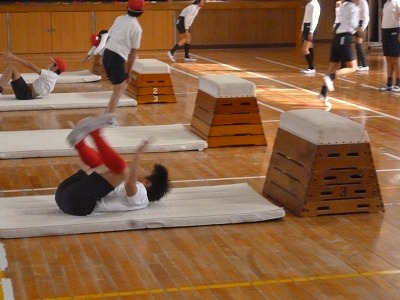 マット運動で、手前に跳び箱を置き、跳び箱を飛び越えて前回りする「飛び込み前転」の練習です。
