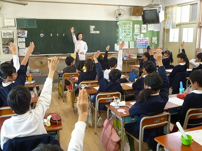 サンスターより歯科衛生士さんに来ていただき、まずは教室で歯についての学習です。