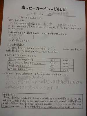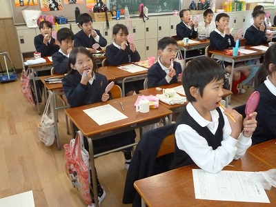 「歯の大切さ」「むし歯の原因」についての説明を受け、その後、「よい歯みがきの仕方」を習いました。