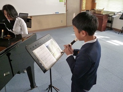 一人ずつ音楽室のピアノの前で、先生の弾くピアノ伴奏に合わせてがんばっていました。