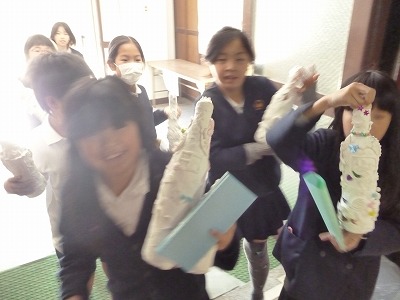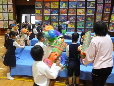 先生の指示に従って、ネームプレートと作品を教室から講堂へ運び入れました。