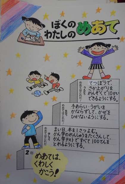 さて、とう登日でくばったかだいの中に、ぼく・わたしのめあてをかくしゅくだいがあります。先生のれいをのせますので、お手本にしてていねいにとりくんでみてください。