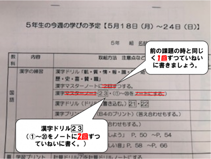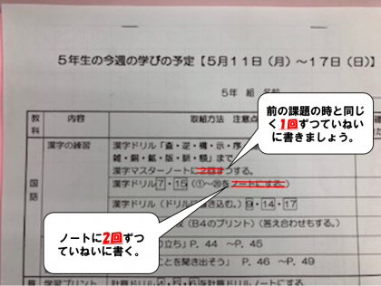 「漢字マスターノートに2回ずつする」⇒「漢字マスターノートていねいに1回書く」
