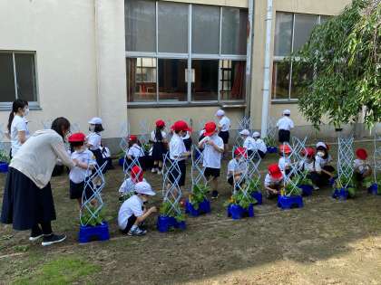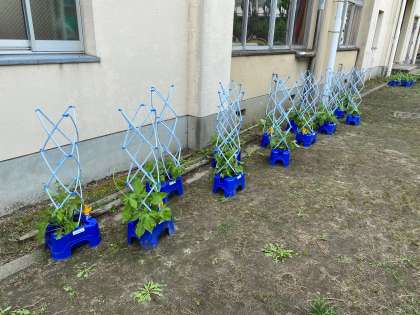 アサガオが成長しています。ツルを巻きつけるための支柱を用意して、肥料も加えました!