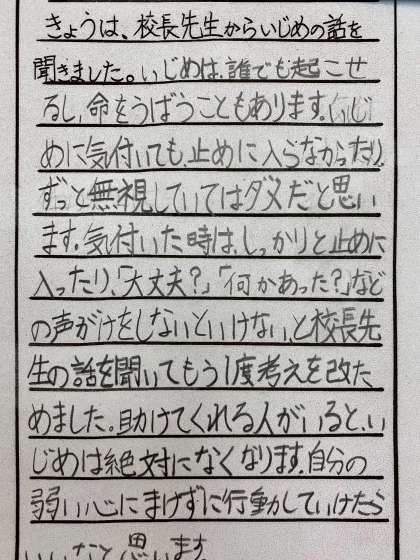 そんな中、今日の朝会で聞いた話から学んだことを書いてくれた作文を紹介します。