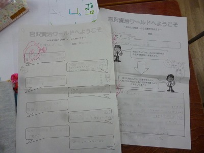 内容は、今までの授業で取り組んでいた「宮沢賢治ワールドへようこそ」というワークシート(主人公にインタビューしてみよう!・おもしろ見出しから記事を作ろう!)を元に、鉛筆での下書き、マジックでの清書、イラストの挿入、装飾と手際よく進めていました。