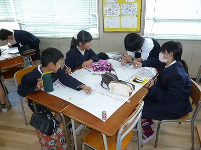 5年2組が国語の時間の取り組みで「壁新聞」を作っていました。
