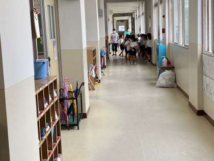 1年生が、静かにそっと並んで会議室へ行くところです。
