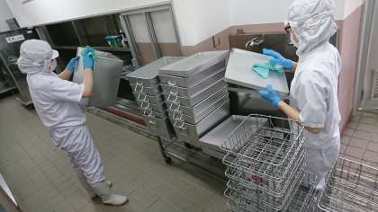 給食調理員さんの朝は早く、子ども達の登校前から仕事が始まります。