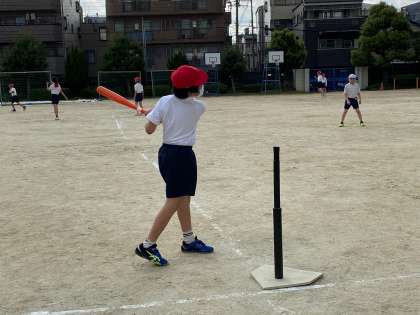 雨が上がり、やっと外で体育ができます。ティーボールというボールゲームです!
