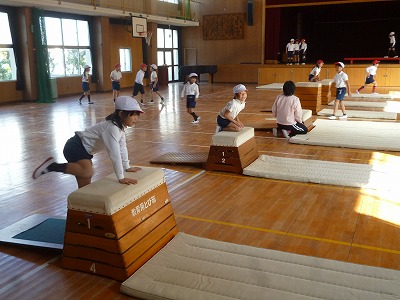 1段の「跳び箱」を飛び越える「跳び込み前転」や「横跳び」にも挑戦していました。