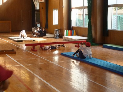 講堂一面(舞台上も)に「跳び箱」「マット」「平均台」を配置し、サーキットトレーニングのように、順に種目をこなしていきます。