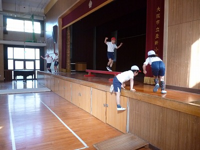 また、「マット」では、前転と後転を、その後、舞台上へ飛び上がっての平均台、舞台からの飛び降りと、子ども達はどんどんとこなしていきます。