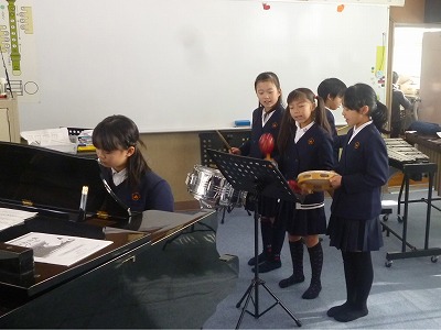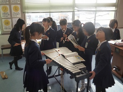 2学期末の音楽の時間に、クラス内で発表会があるそうで、自分たちでグループを決めて、曲目も今までに習った曲から選び、楽器も自由に選択、パートも決めて練習をしているところでした。もちろん歌を入れてもOKでした。