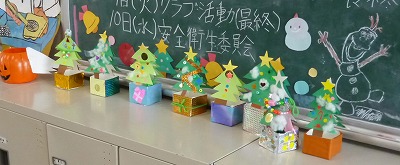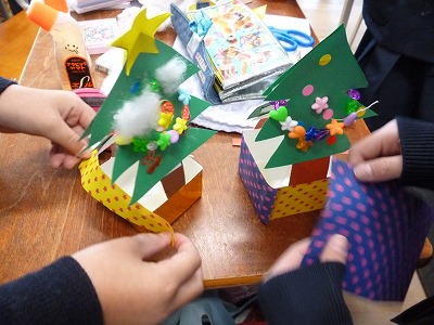 4年生では、牛乳パック、画用紙、折り紙、飾りを使って、かわいらしいお手製のミニクリスマスツリーを作っていました。
